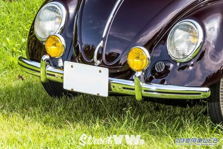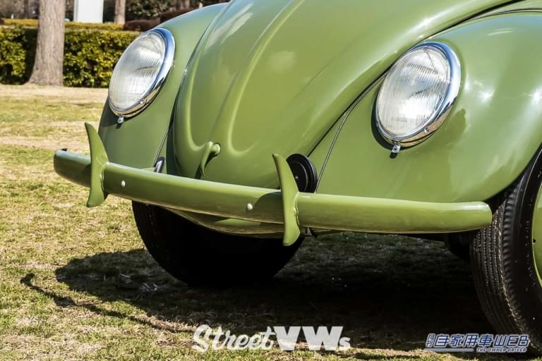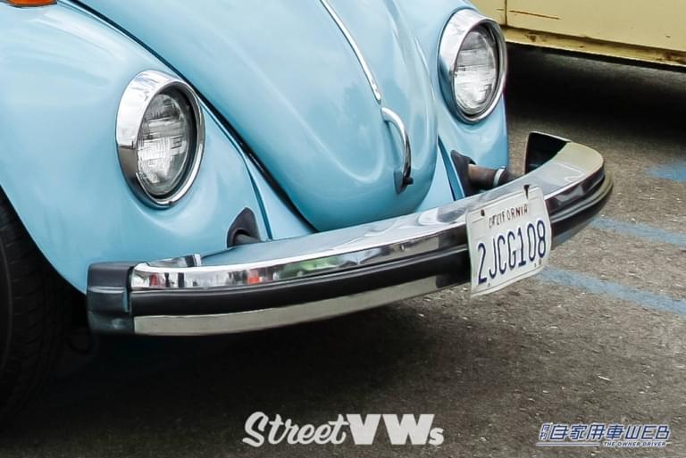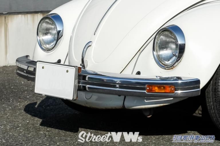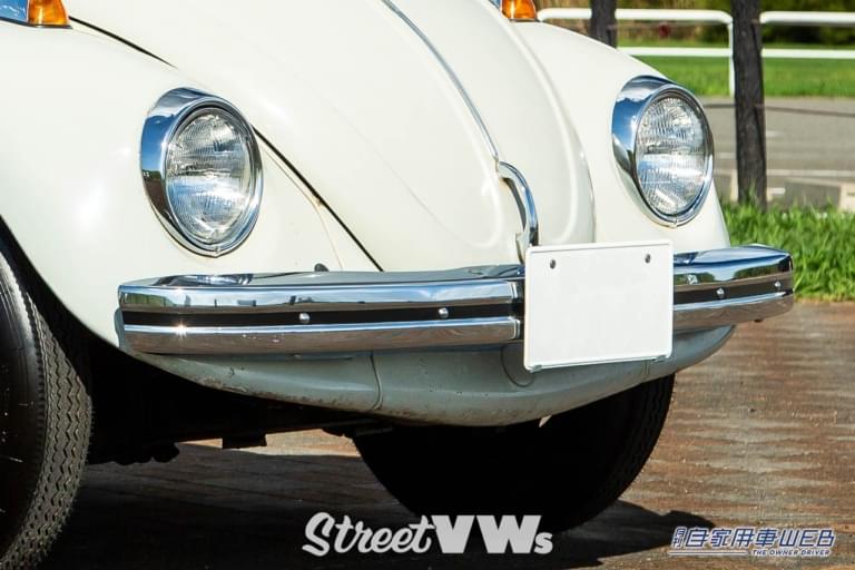 ビートルを大きく低年式と高年式に区切る特徴のひとつがバンパーだ。1968年式から四角い断面形状に変更され、また装着位置も高くなった。日本では、中央にプレスラインが入ることから「プレス・バンパー」と呼ばれている。プレスラインには黒いテープが貼られ、高級グレードにはラバーストリップが装着された。