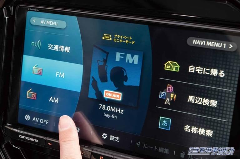 また、表示の見やすさも見逃せないポイントで、今回撮影を行っているAVIC-RQ912では一般的なカーナビに搭載される7型WVGAディスプレイより約1.8倍も大きいうえ2.4倍も高精細な9型HDディスプレイを搭載。しかも画面が大きいため表示されるアイコンも拡大されており、タッチパネル操作も快適だ。