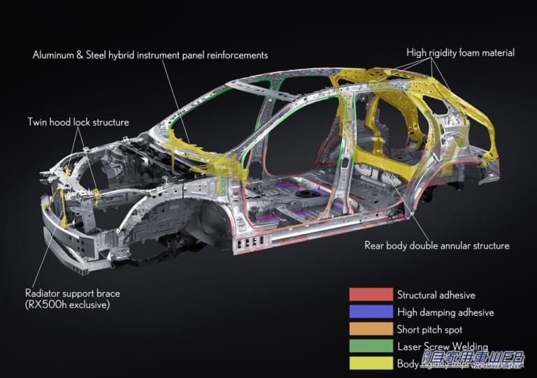 新型RXは、従来型同様にGA-Kプラットフォームを採用するが、さまざまな改良を行っている。まず、軽量化と低床化により、重心高を従来型から15mm下げて、全長は従来型と同様だが、ホイールベースを60mm延長して、トレッドを前15mm、後45mmずつ拡幅。これらにより、ヨー慣性モーメントを低減するパッケージとした。