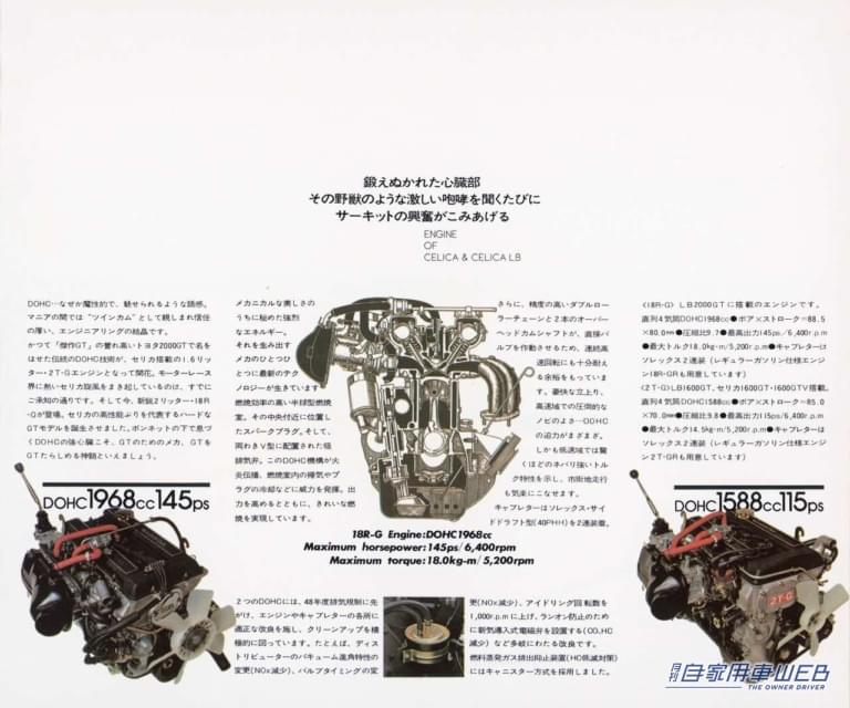 2.0L直4DOHCの18R-Gは、’74年にクーペにも搭載される。