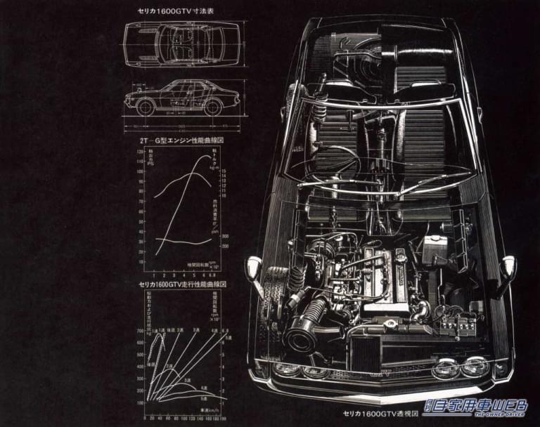 ●全長×全幅×全高:4215㎜×1620㎜×1280㎜ ●ホイールベース:2425㎜ ●車両重量:1040㎏ ●エンジン(18R-G型):水冷直列4気筒DOHC1968㏄ ●最高出力:145PS/6400rpm ●最大トルク:18.0㎏・m/5200rpm ●最高速度:205㎞/h ●0-400m加速:16.1秒 ●燃料消費率:16.0㎞/L ●燃料タンク容量:50L ●トランスミッション:5速MT ●最小回転半径:5.2m ●タイヤサイズ:185/70HR13 ●乗車定員:4名 ●価格:112万5000円(東京地区・1973年当時)