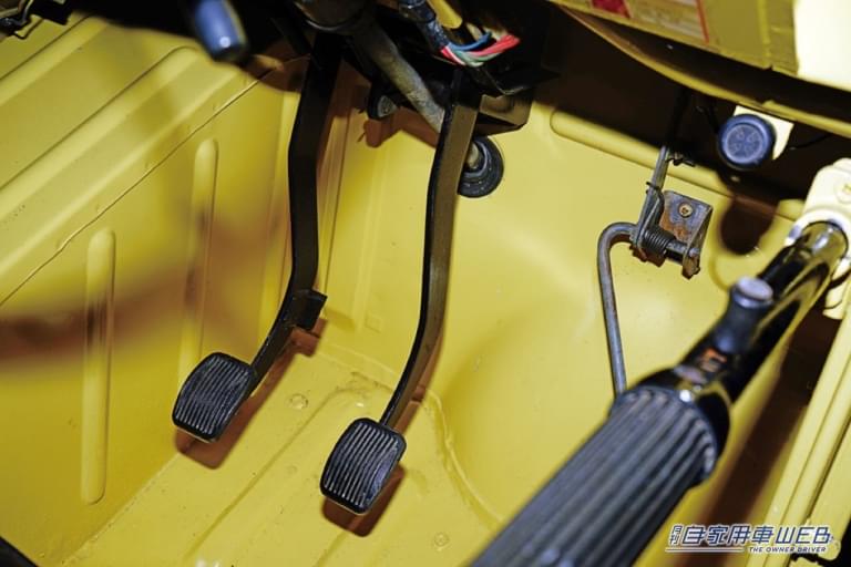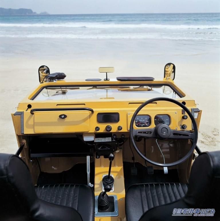 LJ20型のインパネ。空冷のLJ10型と基本デザインは変わらない。4速の主変速シフトと2速のトランスファーの左、助手席側の床から伸びているのはハンドブレーキレバー。助手席前のグローブボックスはキー付きだ。