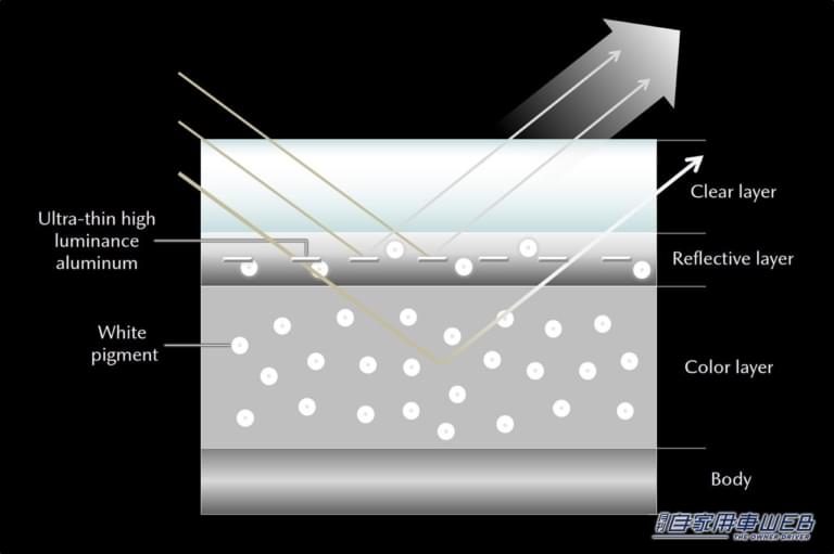 ロジウムホワイトプレミアムメタリック」では、「匠塗TAKUMINURI」を進化させ、クリア層、反射層、カラー層(発色層)の三層のみで、優れた表現性を持つカラーとして量産化することに成功している。