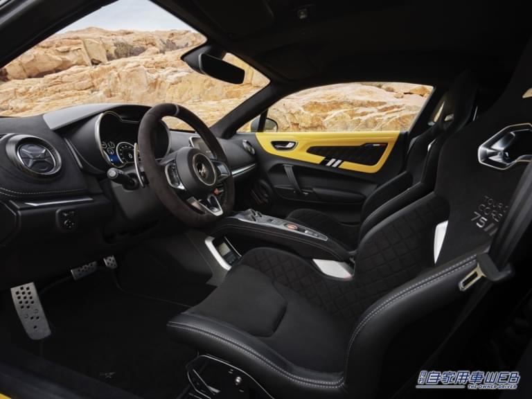 アルピーヌA110「ツール・ド・コルス75」は、わずか150台。日本での販売は不明だが、1~150のナンバープレートがセンターアームレスト下に貼られる。この限定モデルには、AndroidAutoおよびApple Carplay接続機能を備えた新しいアルパイン・マルチメディア・システムも搭載する。
