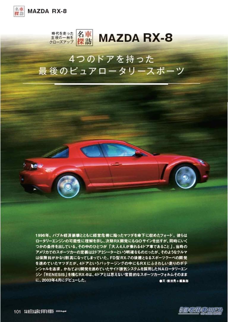 1996年、バブル経済崩壊とともに経営危機に陥ったマツダを傘下に収めたフォード。彼らはロータリーエンジンの可能性に理解を示し、次期RX開発にもGOサインを出すが、同時にいくつかの条件を出している。その中のひとつが「大人4人が乗れる4ドア車であること」。当時のアメリカでのスポーツカーの定義は2ドア2シーターという明確なものだったが、そのようなクルマは保険料がかなり割高になってしまっていた。FD型RX-7の後継となるスポーツクーペの開発を進めていたマツダだが、4ドアというパッケージングの中にもR Xにふさわしい走りのポテンシャルを追求。かねてより開発を進めていたサイド排気システムを採用したNAロータリーエンジン「RENESIS」を積むRX-8は、4ドアとは思えない官能的なスポーツカーフォルムそのままに、2003年4月にデビューした。