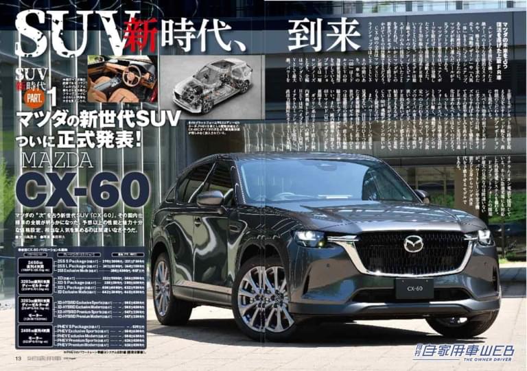 予想以上の性能と魅力十分な価格設定、相当な人気を集めそうなマツダの新世代SUV「CX-60」。今月号では、エクステリアやインテリアを中心に、プラットフォーム&ボディやパワートレーン、ベストバイのグレード選びなど、盛りだくさんの情報でお届けしている。