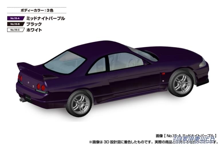 今回発表された「ザ☆スナップキットNo.15-A/No.15-B/No.15-Cニッサン R33 スカイライン GT-R」は、完全新金型で製造されるパーツ点数25点のお手軽モデルだ。選択式でローダウン仕様にすることも可能になっている。カラーも「No.15-Aミッドナイトパープル」、「No.15-Bブラック」、「No.15-Cホワイト」の3色をラインナップ。