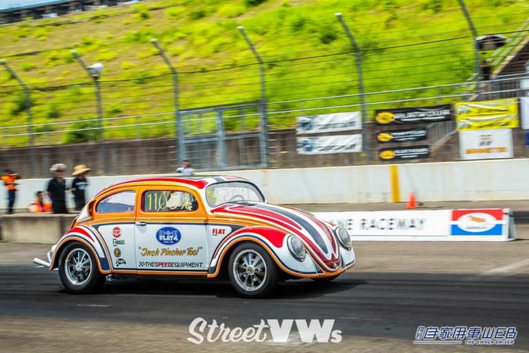 そこでFLAT4は、モビリティリゾートもてぎで開催されたVWのドラッグレース「VW Drag In」にInch Pincher Too!をエントリー。特別なデモ走行ではなく、通常のエントリー車両に混じってPro Gasクラスに出場しました。