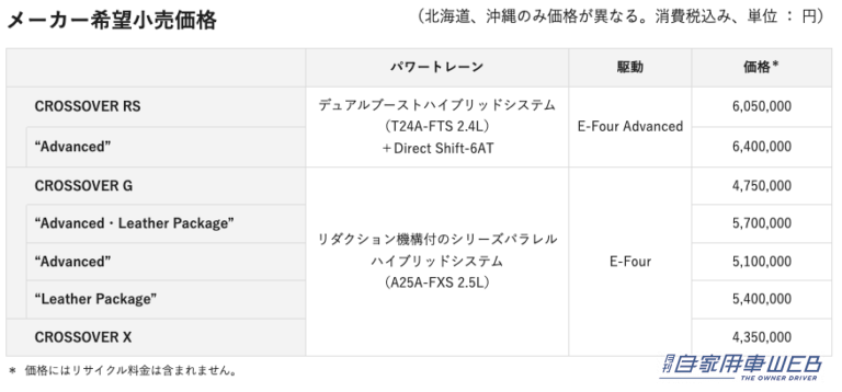 さらに、支払い方として、「解約金フリープラン」を選ぶと、所定の申込金を支払うことで、中途解約にかかる解約金をゼロにするとともに、当初設定の3年の契約期間の満了後も、乗っているクルマを引き続き利用可能。CROSSOVER G“Advanced・Leather Package”でこのプランを選択の場合、月額は89,100円(税込み)から利用可能だ。
