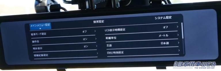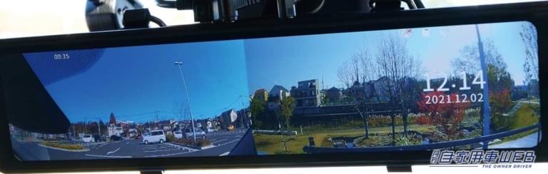 デジタルルームミラーと2カメラドラレコが同時に手に入るミラー型。電源OFF時には市販ワイドミラーのように見えるが、起動すると鏡の部分が12型ディスプレイへと切り替わり、リヤカメラの映像を常時表示する。後席に人が乗っていたりラゲッジに荷物が満載でも後方視界が妨げられず、夜間は肉眼よりも明るく見える。