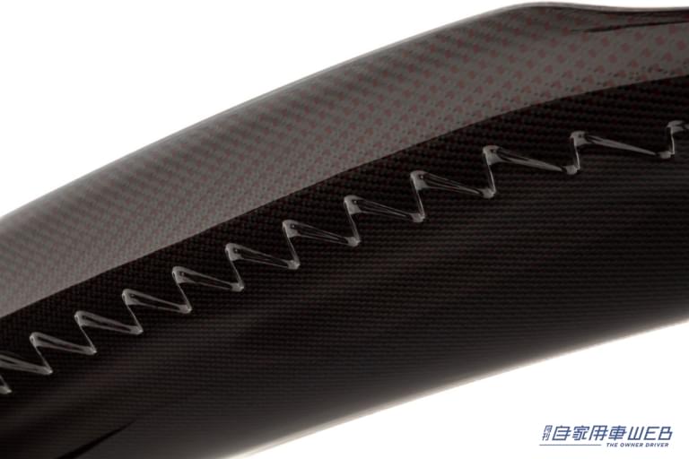 スポイラー下面には、特徴的な造形の実効空力デバイスを配して、標準仕様とはひと味異なる「シビック タイプR」のスポーティな乗り味のカスタマイズを楽しめるという。また、ドライカーボン製とすることで約1㎏の軽量化を実現し、一体型ながら翼端板とウイング部を独立して見せるデザインに加えてカーボン繊維にレッドポリエステルを編み込んだ素材をクリア塗装で仕上げ、スポーティさと上質さを両立している。