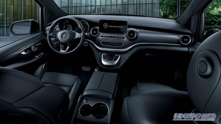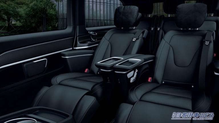 全長5,380mm、ホイールベース3,430mmを確保し乗員全員が足を伸ばせるほどの広さがあり、優れた快適性と積載性を誇るV 220 d アバンギャルド エクストラロングをベースに、フロントグリルやフロントバンパー、サイドミラーにブラックアクセントを施すとともに、足元には専用のブラックペイント19インチAMG7ツインスポークアルミ ホイールを採用することで、迫力のある引き締まったエクステリアに仕上げている。