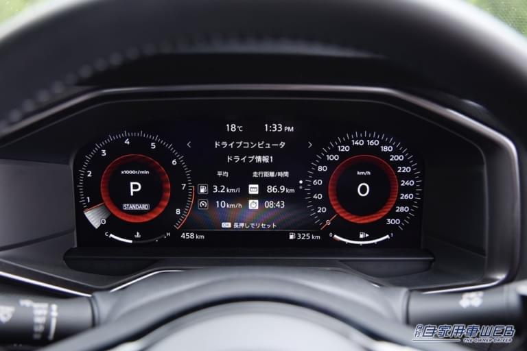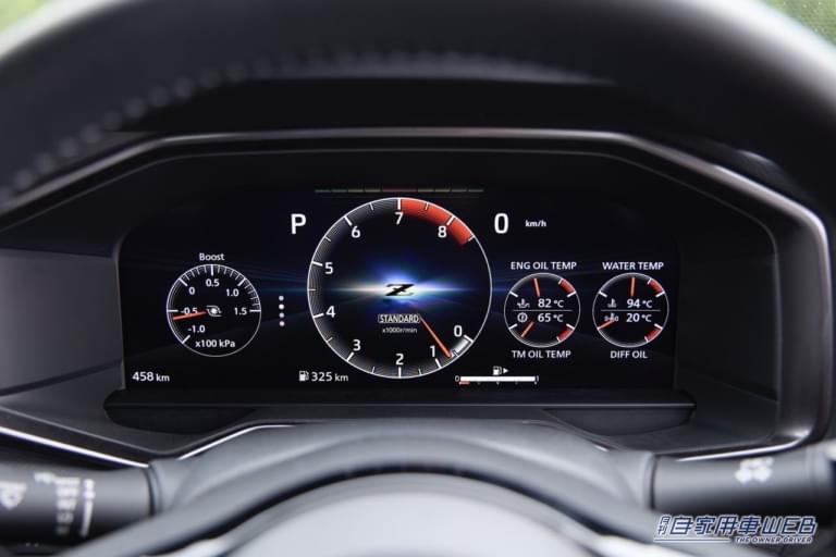 ドライバーの好みに合わせて変更できる3つの表示モードを用意するアドバンスドドライブアシストディスプレイ(12.3インチカラーディスプレイ)。全グレードに標準装備され、フェアレディZ専用のスポーツモードはSUPER GT500ドライバーである松田次生選手のアドバイスによりタコメーターを中央に配置。シフトアップタイミングが分かるシフトアップインジケーターを設定されている。
