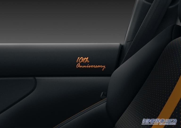 インテリアには、運転席と助手席ドアトリムのショルダーパット部に10周年記念刺しゅうをあしらい、インテリアカラーも特別設定となる、ブラックを基調にオレンジのアクセント、キャストブラック加飾を採用。ボディカラーとの統一感を演出している。