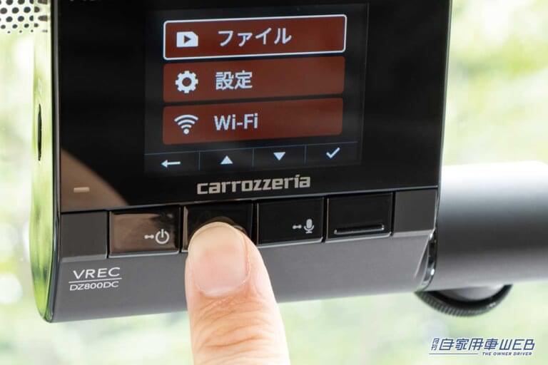 カロッツェリアの最新、最上級機。スタイリッシュな本体は薄型でガラスに直付けでき、視界を妨げたり目障りになることがない。とくに傾斜したフロントガラスのクルマとマッチングがいい。組み合わされるリヤカメラはコンパクトなブラケット一体型で取り付け性に優れている。Wi-Fi接続したスマホ(無料専用アプリをインストール)で設定操作や記録映像のダウンロードができるのも便利だ。