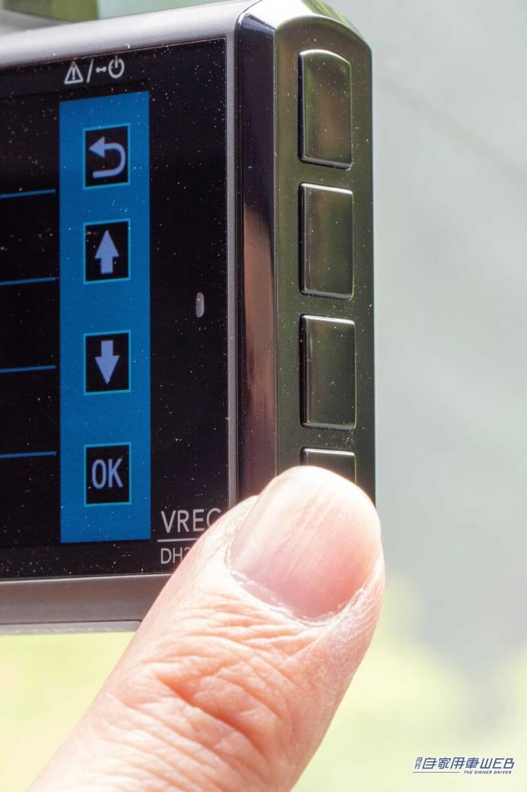 手が届きやすい右側面に装備されたボタンは大きくて扱いやすい。ドライブレコーダーを初めて購入する人でも快適に扱えるだろう。