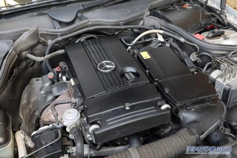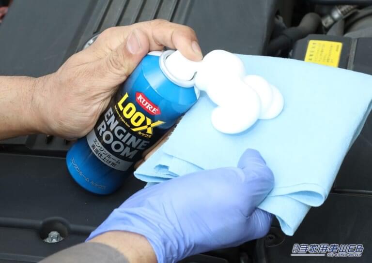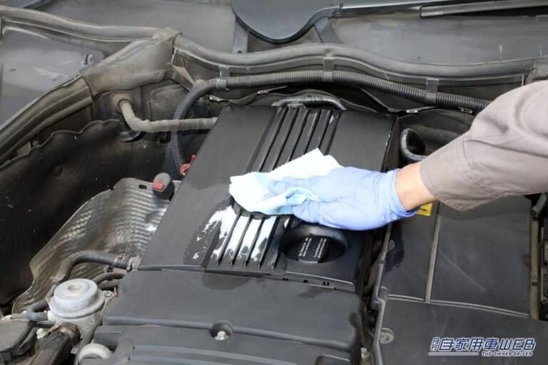 ホコリが積もって白っぽくなってしまったエンジンルーム。テスト車は年式が古いのでエンジンカバーは小さいが、カバー以外のプラスチック、ゴム、金属パーツにも使用可能。