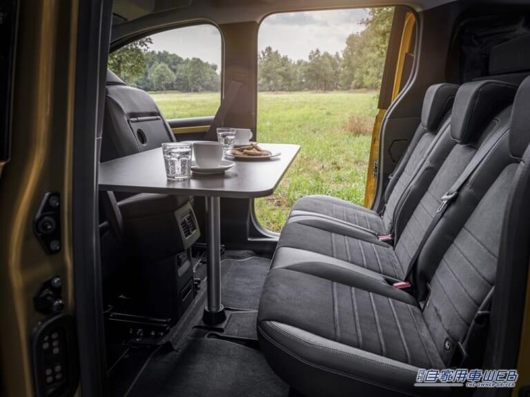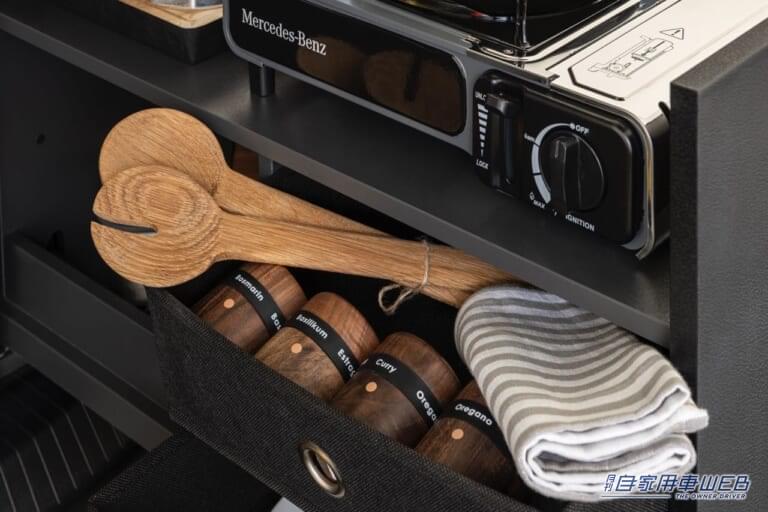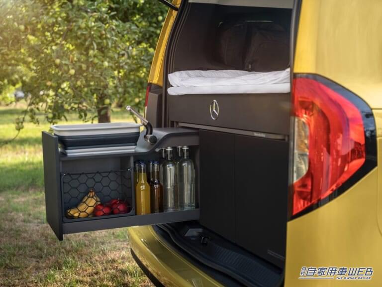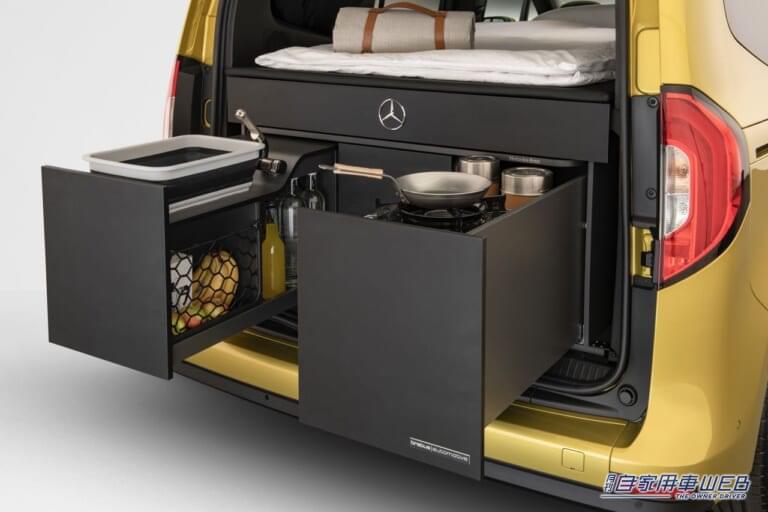 オプションのキッチンユニットは、プッシュトゥーオープン&ソフトクローズ機構を採用した引き出しをベースとし、12Lの水タンクを備えたシンク、15Lの冷蔵庫、必要に応じて簡単に取り外せるガスカートリッジ式クッカーなどを装備する。引き出しには、カトラリーや食器、食材を収納できるスペースがあり、2脚のキャンピングチェアとテーブルも搭載している。このテーブルは2種類の足が付属しており、屋外での使用はもちろん、新型Tクラスのセンターコンソールの後ろに設置することも可能だ。