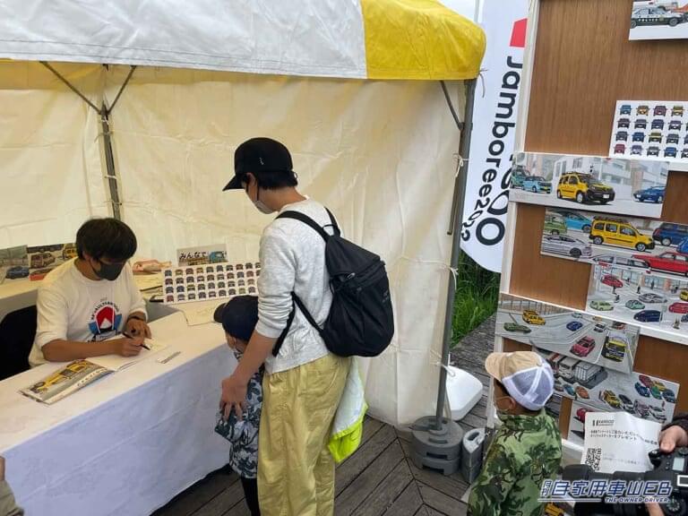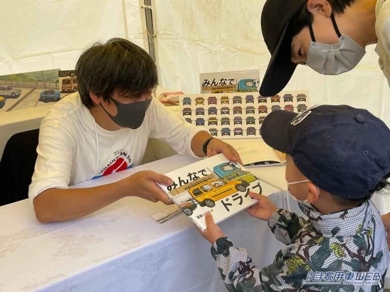 こちらは、絵本『みんなでドライブ』の作者、遠藤イズルさんのサイン会。細密で柔らかなタッチで描かれるカングーは、ファンにとっても嬉しい逸品。そこに遠藤さんのサインが入ればなおのこと。
