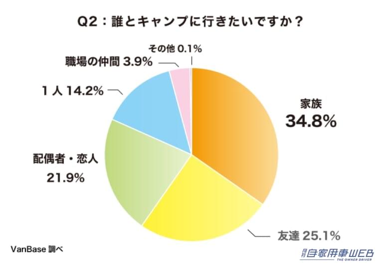 続いて、Q1でキャンプが「好き」と回答した人に、 誰とキャンプに行きたいかを聞いたところ、 最も多かったのは「家族」で34.8%。 続いて「友達」が25.1%、 「配偶者・恋人」が21.9%という結果に。 「1人」と回答する人も14.2%おり、ソロキャンプ需要の高まりも感じられる。