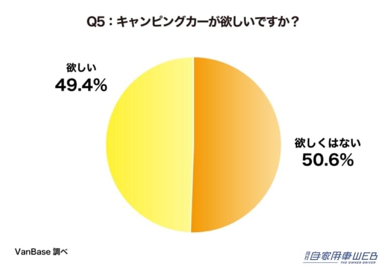 Q5では、キャンピングカーは欲しいか?の質問をしたところ、半数が欲しいと回答。