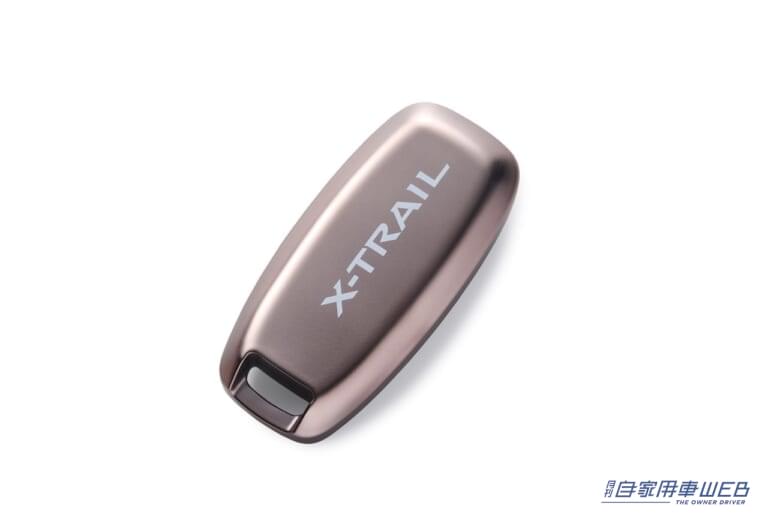 新型インテリジェントキーに対応した、X-TRAILロゴ入りキーケース。車体カラーのシェルブロンドをイメージした色合いだ。