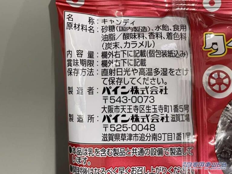 当然ながら製造者はどちらもパイン株式会社。原材料については双方ともに[砂糖(国内製造)]が主に使われている。パインアメにパイナップル果汁が入っているので、タイヤアメにはゴムが使われているかと思いきや、含まれていなかった。安心である。