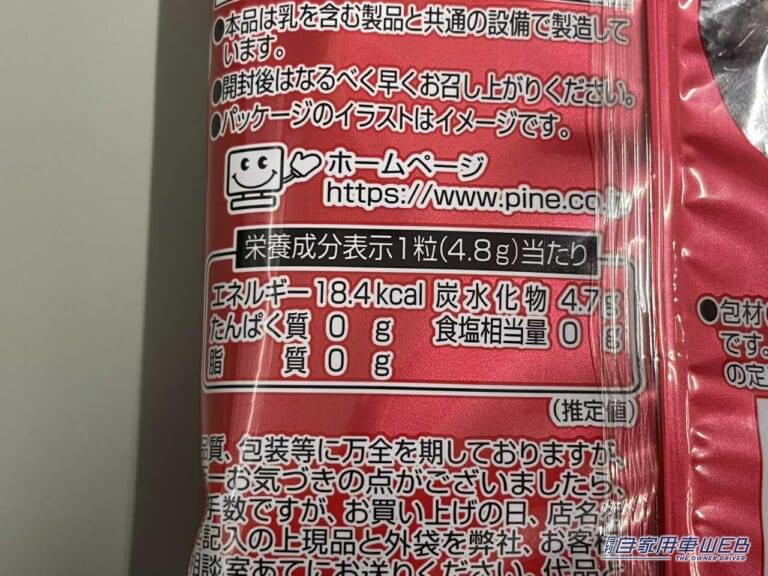 栄養成分はほぼ同じ。一粒あたり0.3kcalだけパインアメの方がカロリーが高い。パインアメにはわずかに食塩も含まれているようだが、タイヤアメには含まれていない。ゴムは塩が混ざると耐久性が落ちるので、タイヤアメと言うだけに、高耐久を意識した配合なのかもしれない。