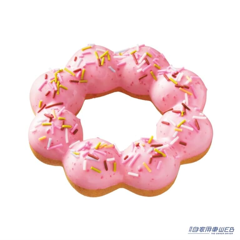 ポン・デ・リング生地をストロベリーチョコでコーティングし、カラーシュガーをトッピング。