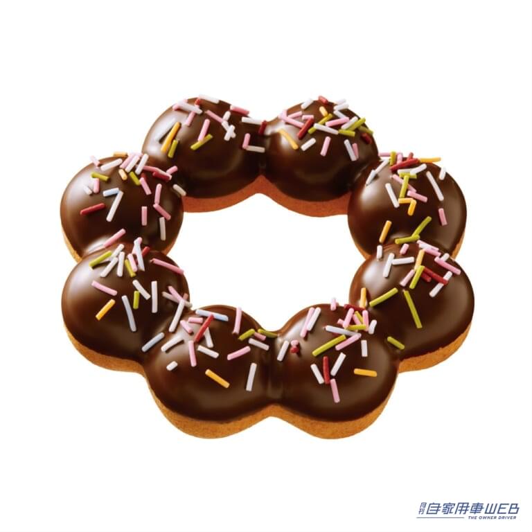 ポン・デ・リング生地をチョコレートでコーティングし、カラーシュガーをトッピング。