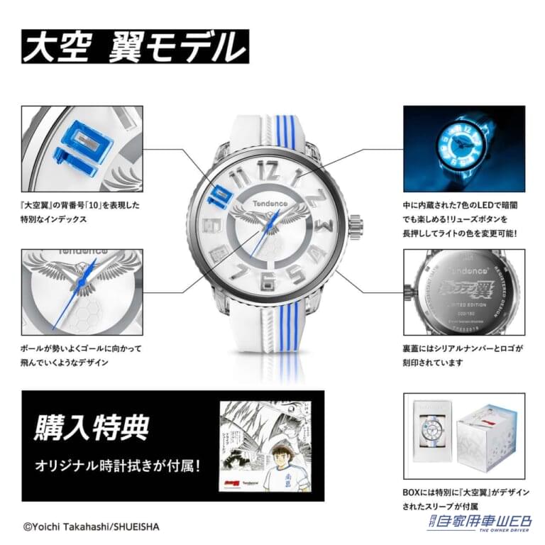 漫画『キャプテン翼』の主人公である『大空翼』をイメージした時計。サッカー経験者であれば一度は夢見た必殺技の「ドライブシュート」をイメージし、原作者である高橋陽一先生監修の下、勢いよくゴールに向かって飛んでいくボールをデザインしている。ユニフォームをイメージしたベルトや、背番号の「10」のインデックスにポイントカラーを使用。価格は45,100円、150本限定となる。