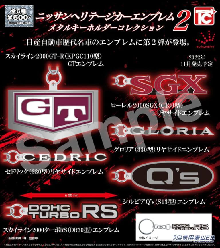 好評を博したニッサン・ヘリテージカーエンブレムメタルキーホルダーコレクションの第2弾が登場!ラインナップは「スカイライン2000GT-R(KPGC110型)GTエンブレム」、「セドリック(330型)リヤサイドエンブレム」、「グロリア(330型)リヤサイドエンブレム」、「ローレル2000SGX(C130型)リヤサイドエンブレム」「スカイライン2000ターボRS(DR30型)エンブレム」「シルビアQ’s(S13型)エンブレム」の全6種類。自分の愛車や思い出の車がラインナップされていたら、手に入れないわけにはいかないアイテムだ。(本製品は日産自動車株式会社のライセンス許諾により製造している)