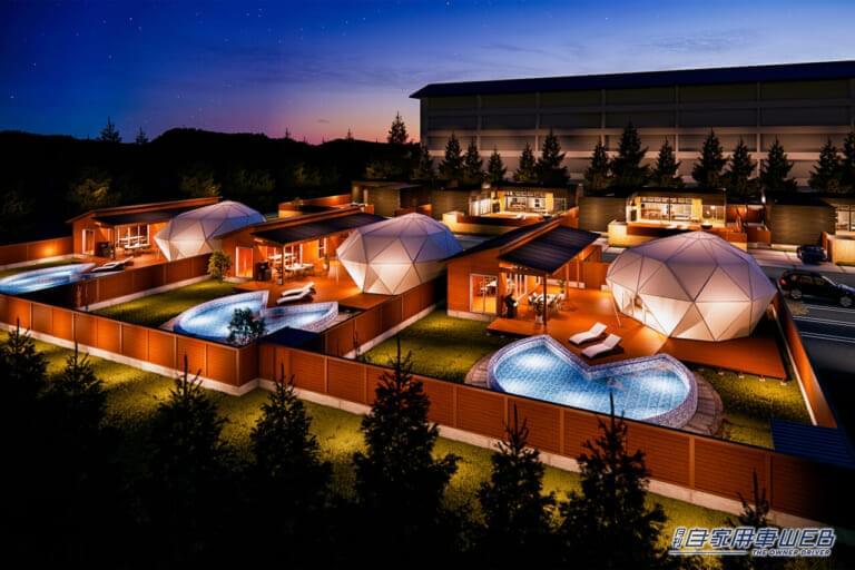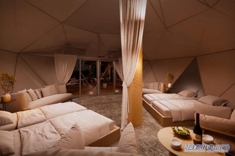 山梨県山中湖エリアの富士山を望む自然豊かな場所に、客室温泉・プライベートサウナ・プライベートプール・キャンプファイヤー付の高規格グランピング施設が誕生する。誰にも邪魔されないプライベート空間と、グランピングならではの非日常を体験しよう。
