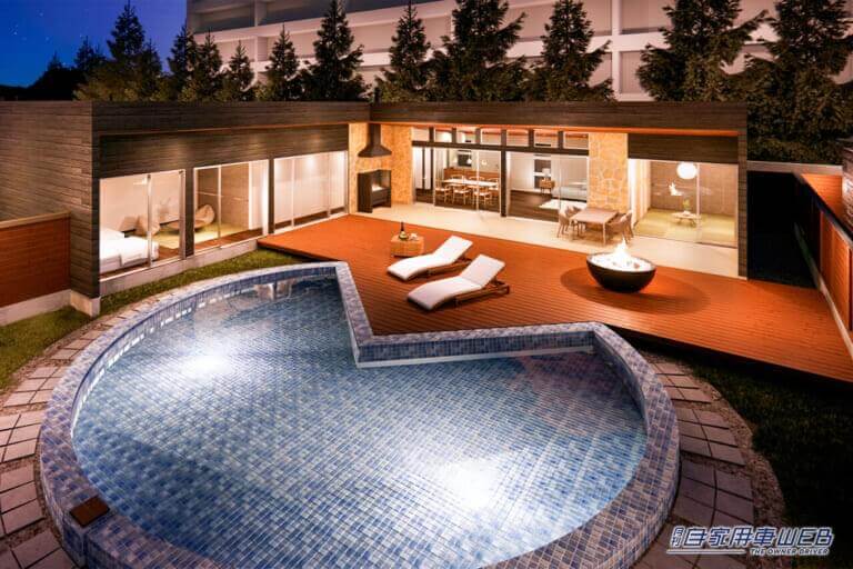 都心から約90分とアクセスが良く、富士山を望む絶景とレイクアクティビティなどが楽しめる、人気観光地の山梨山中湖エリア位置。全棟プライベートプール、客室温泉、ファイヤーピットを備えた、これまでにないプライベート空間をお楽しむことができる施設だ。