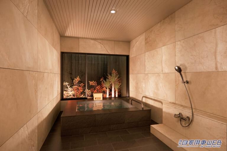 全棟天然温泉を楽しめるよう客室温泉風呂を用意。プライベート空間なので24時間いつでも好きな時間に、のんびり入浴することができる。小さい子供にもやさしい単純温泉で、誰でも安心だ。
