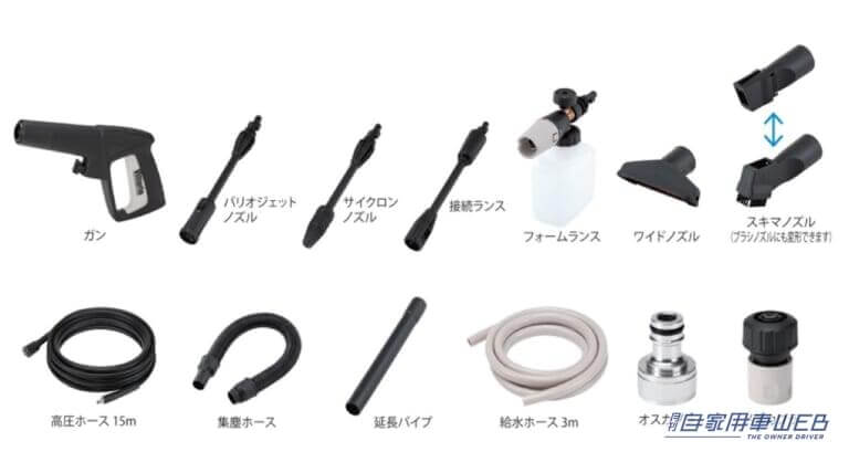 付属のフォームランスを使えば、密着性の高い本格的な泡が吐出され、また本体には、業務用のクリーナーモーターを搭載。室内の砂利やホコリを強力に回収してくれる。さらに、ブロワー機能もあるため、ボディ表面の水滴を吹き飛ばすことが可能。電源は100Vを使用。現在、全国のホームセンターへ導入中で、11月中旬より各所ECサイトでも順次販売を開始する。