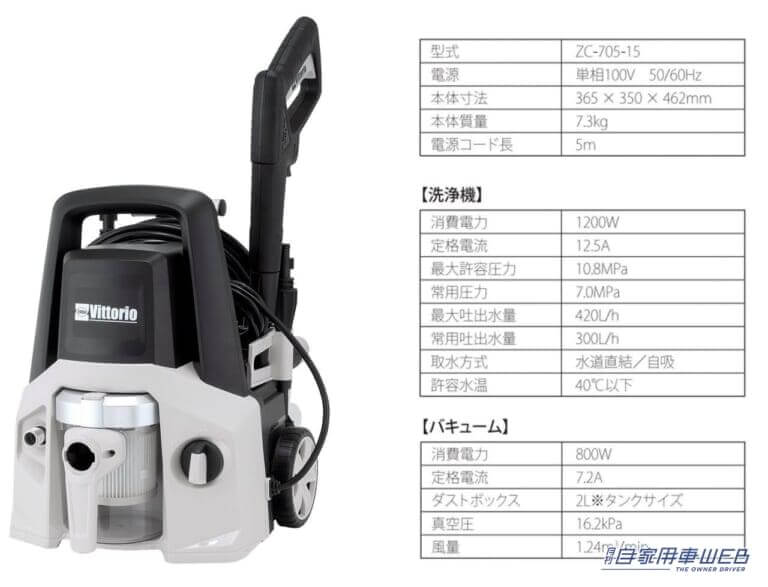 ZC-705-15は、高圧洗浄機Vittorioシリーズを展開している蔵王産業が開発した洗車に特化した高圧洗浄機だ。1台で高圧洗浄・泡洗浄・ブロワー(吹き飛ばし)・バキューム機能を可能にした3in1となっており、愛車のボディ(泡洗浄・高圧洗浄)、車内(吸塵機能)を清潔に保つことなどが可能となっている。