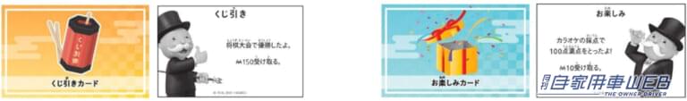 「モノポリー 日本版」では2種類のカードを用意。「くじ引きカード」では、ラッキーまたはアンラッキーな出来事が待ち構えており、プレイヤーの運が試される。「お楽しみカード」では、カラオケ・ゲーム大会で優勝してお金がもらえるなど「モノポリー 日本版」ならではのコンテンツを楽しめる。