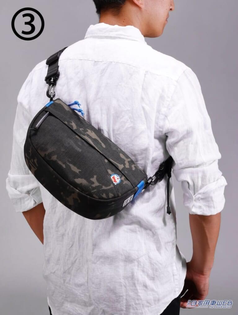3.すると同時にストラップが縮んで、バッグ本体が背中にフィット。