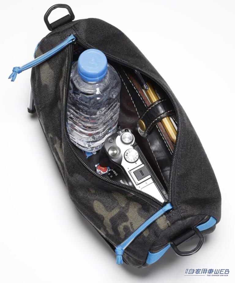 マチが広いので見た目以上に荷物が入り、出し入れも容易。財布や手帳、デジカメや35mlペットボトルなど、見た目よりも多くの荷物を収納できる。国内の鞄職人が丁寧に仕上げたバッグだ。