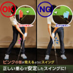『ダイヤPRO AIの手』はピンクと青で片面ずつ色が異なっている。インパクトまでピンクの面が見えるようにスイング練習することで頭が残り、正しい重心で安定したスイングが身に付く。青い面が見えてしまうと、すくい打ちになっていることが視覚的に分かるのだ。