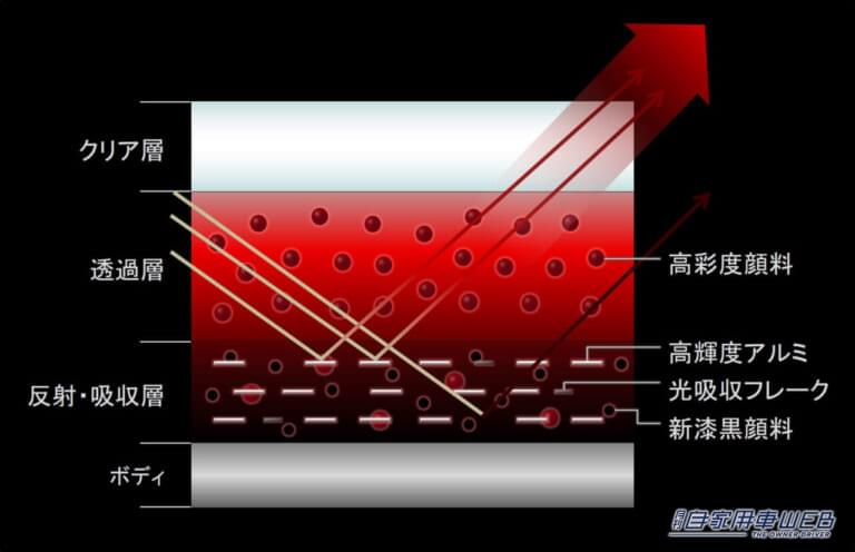 透過層にはソウルレッドクリスタルメタリックで採用した、人間が最も赤みを感じる高彩度顔料を採用し、反射・吸収層には、匠塗第3弾のロジウムホワイトプレミアムメタリックに採用した、アルミフレークをより平滑かつ等間隔に並べる技術と、第2弾のマシーングレープレミアムメタリックでシェード部の表現に用いた漆黒顔料が改良されて採用されている。