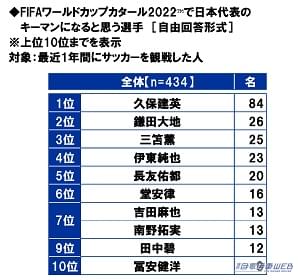 FIFAワールドカップカタール2022で日本代表のキーマンになると思う選手を聞いたところ、現在所属しているスペインのレアル・ソシエダでも高い評価を得ている久保建英選手がダントツで1位。2位「鎌田大地」、3位「三笘薫」、4位「伊東純也」、5位「長友佑都」が続いた。