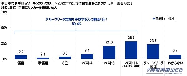 日本代表がFIFAワールドカップカタール2022でどこまで勝ち進むと思うか聞いたところ「ベスト16(グループリーグ突破)」(28.3%)が最も高くなり「グループリーグ敗退」(23.5%)、「ベスト8」(21.0%)が続いた。グループリーグ突破を予想する人の割合は69.4%と、7割の人は日本代表のグループリーグ突破に期待を寄せているようだ。