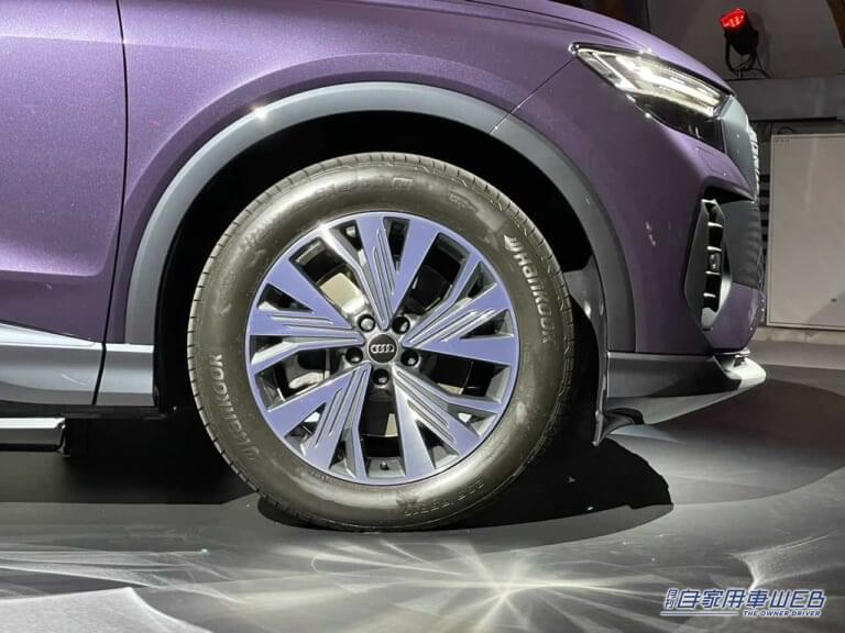 会場の中心に展示されていたのはパープルの「Q4 e-tron」。ライトに照らされた車体は、デザイン、色味、パーツの輝きが非常に美しかった。