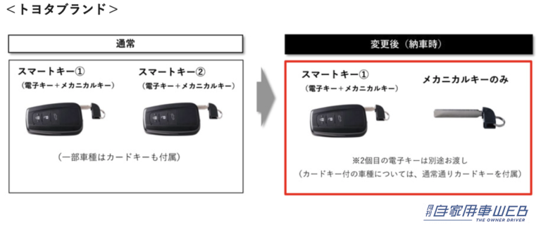 トヨタは今後生産を予定している一部の車種において、暫定的に、スマートキー1個(電子キー+メカニカルキー)およびメカニカルキー1個の状態で納車する。