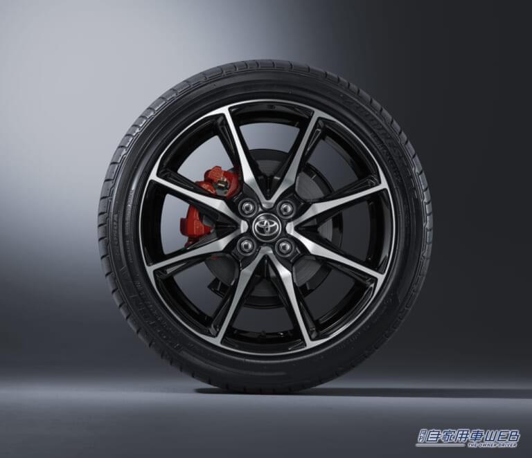 205/45R17タイヤ(POTENZA RE050A)及び専用17インチアルミホイール(切削光輝+ブラック塗装/センターオーナメント付き)を採用。アルミホイールはまっすぐ伸びやかなスポークでスポーティな意匠。タイヤはグリップとコーナリング性能を高次元で実現。また、フロントブレーキキャリパーはGRロゴ入りの赤色塗装でスポーティなイメージを強化している。