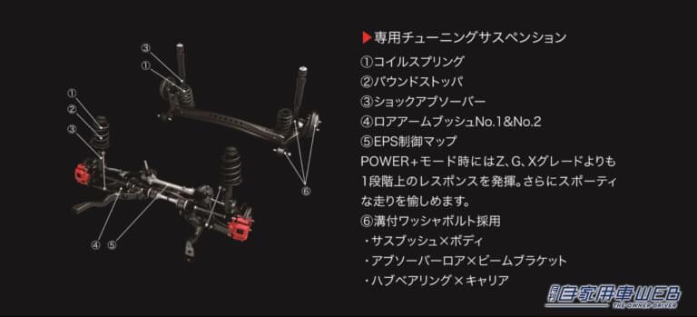 アブソーバー特性やコイルスプリングの専用チューニング、スタビライザーの特性変更、専用バウンドストッパーの採用、ロアアームのブッシュの特性変更等により、優れた応答性、適切な車両姿勢やコントロール性能、質感の高い乗り心地を高次元で両立。