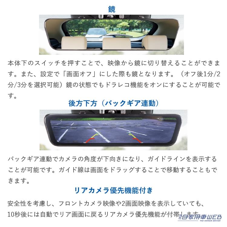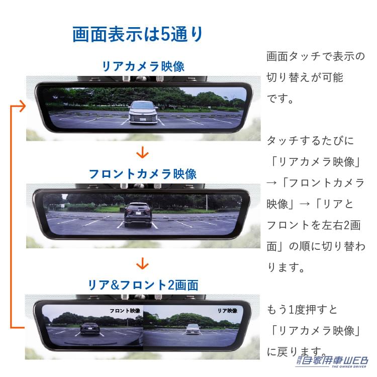 画面表示はリヤカメラ映像の他にフロント映像やフロントとリアの2画面表示も可能。また通常の鏡としても利用しながらの録画も可能なので、状況に応じて画面を切り替えて使うことができる。また運転中の操作は危険なため、音声操作を利用して画面切替もできる機能も搭載。