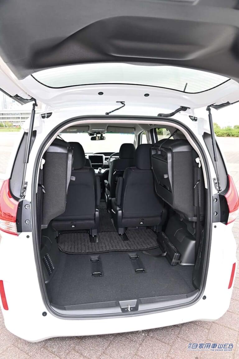 また、スライドドアのステップは地上高39cmと低く、荷物や子どもを抱っこしたままでも乗り降りがラク。2列目シートのロングスライドで大人もゆったり座れ、着替えなど子どものお世話がしやすい空間です。3列目は跳ね上げ格納式で、操作が重く片手では無理なのが弱点ですが、低床の荷室は大きな荷物も積みやすく、2列目キャプテンシートタイプなら26インチ自転車も積める大容量です。